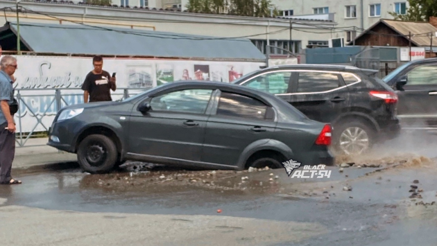В Новосибирске в Ленинском районе из-за коммунальной аварии автомобиль частично провалился в яму
