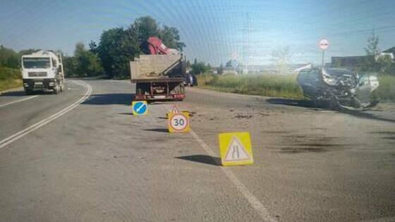 ДТП произошло в субботу, 15 июля, в 12:00. Ехавший по главной дороге 33-летний водитель MAN столкнулся с легковушкой, поскольку водитель последней не успел вовремя сбавить скорость. Машина потеряла часть капота, 64-летняя пассажирка получила травмы.