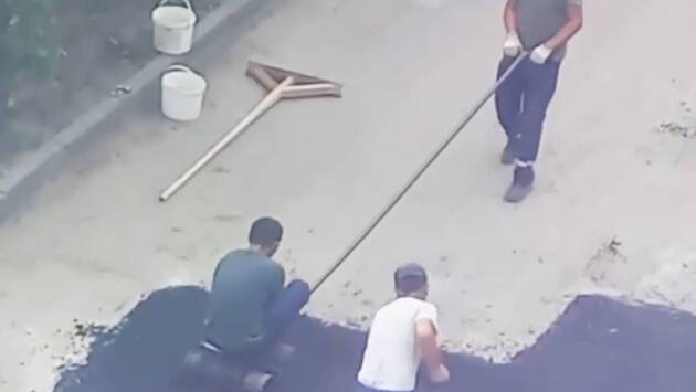Ремонтные работы попали на видео. На кадрах показано, как рабочие уплотняют уложенный асфальт. Для этого они используют самодельный валик с длинной ручкой. Один из рабочих водит инструментом по асфальту, при этом на крепеже валика сидит другой рабочий, помогая таким образом добавить вес самодельному устройству.