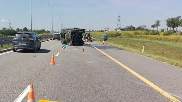 Пострадал пассажир: под Калининградом из-за лопнувшего колеса опрокинулся грузовик