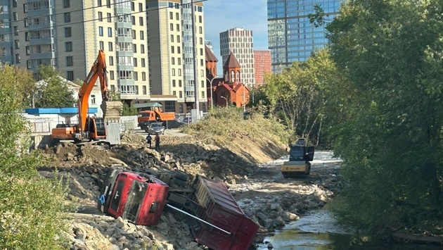На фотографии, которой поделился источник агентства, видно, что грузовая машина "лежит" на боку на засыпанной грунтом части Исети. Его поднятый кузов частично погружен в воду.