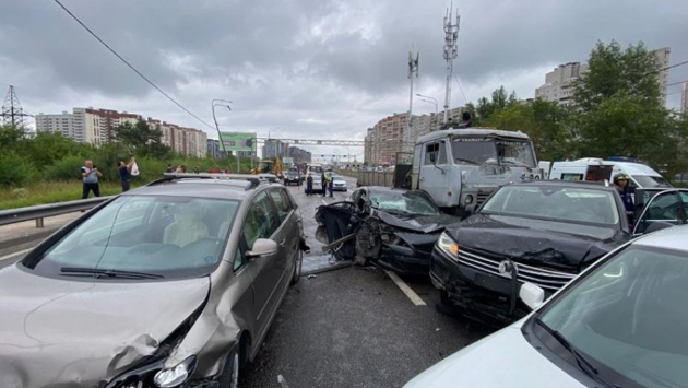 Инцидент произошел на улице Антонова-Овсеенко. На записи видно, что черный Opel Astra при перестроении столкнулся с экскаватором-погрузчиком JCB и «КамАЗом», в результате чего машины отбросило на другие автомобили. Повреждения также получили Volkswagen Golf, Datsun on-DO, Hyundai Solaris, Jeep Grand Cherokee, Lada Granta, Volkswagen Touareg и Chevrolet.