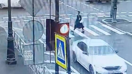 На представленном видео видно, как горожанка переходит дорогу на красный сигнал светофора. В это время автобус поворачивает и сбивает женщину с ног.