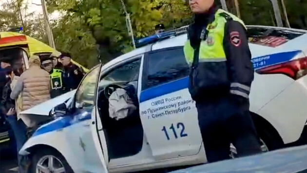 В Пушкине (входит в состав Санкт-Петербурга) полицейский автомобиль врезался в Mercedes-Benz, сообщает «Фонтанка.ру» и публикует видеозапись инцидента.