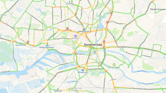 Из-за шести аварий в разных частях Калининграда собираются пробки. Об этом говорят данные сервиса «Яндекс.Карты».