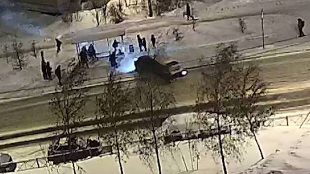 На опубликованных с места происшествия кадрах видно, как машину при повороте на перекрестке заносит из-за гололеда, из-за чего она въезжает в автобусную остановку, где стоят около десяти человек.