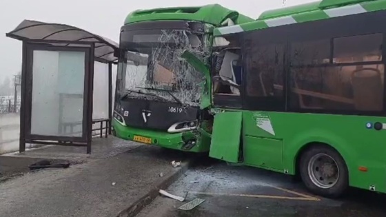 Авария произошла на остановке "Метеостанция". Volgabus под управлением 45-летнего водителя врезался в автобус той же марки, отъезжавший от остановки.