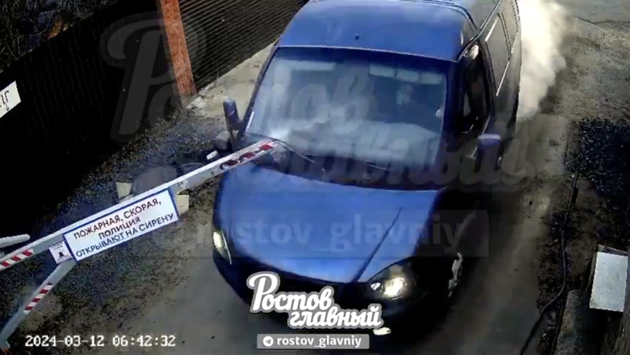Ростовский водитель не успел проехать шлагбаум и врезался в него — острие пробило насквозь лобовое стекло автомобиля. Видео произошедшего опубликовал Telegram-канал «Ростов Главный».