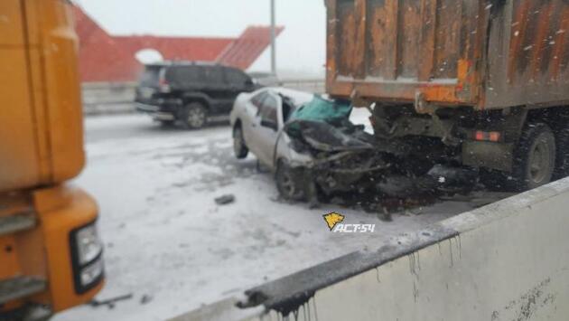 Лихач на седане врезался в КамАЗ на Бугринском мосту в Новосибирске