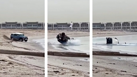 В коротком видеоролике показано, как сине-белый FJ Cruiser проезжает по пляжу Абу-эль-Хасан в Кувейте. Вначале внедорожник медленно едет очень близко к берегу, а водитель по неустановленной причине открывает дверь.