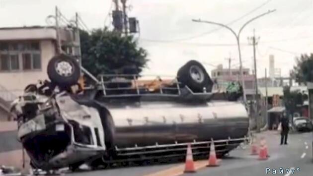 Житель прибрежного района Гуаньинь (город Таоюань, Тайвань), 10 апреля оказался на месте столкновения двух большегрузов, один из которых перевернулся.