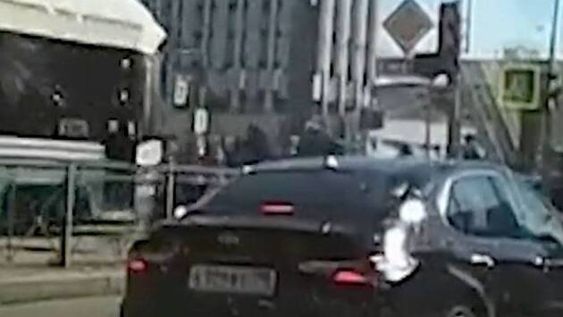 На кадрах видно, как люди переходят дорогу по пешеходному переходу, когда их таранит трамвай, который уже после столкновения проезжает еще несколько метров, прежде чем затормозить.