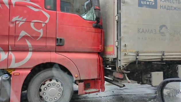 Очевидцы произошедшего поделились кадрами с места аварии. На предоставленном фото видно, что столкнулись два большегруза.