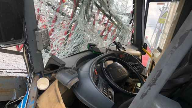 На фотографиях видно, как сильно передняя часть автобуса смята, лобовое стекло разбито.
