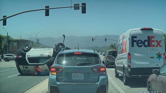 В объектив видеорегистратора попал момент, когда полицейская машина, сделав нескольео переворотов, приземлилась на колёса, в тот момент, когда другой участник аварии продолжил движение по автомагистрали.