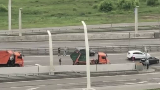 Судя по видео, после столкновения с автомобилями, грузовик MAN пересек тротуар и остановился на его краю. Кабина машины разбита со стороны пассажиров. Впереди примерно в 200 метрах на шоссе стоит поврежденный Kia Soul.