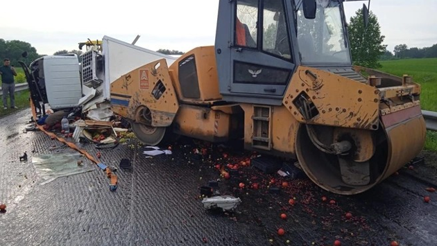 Фруктовый грузовик "познакомился" с катком и асфальтоукладчиком под Новосибирском
