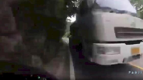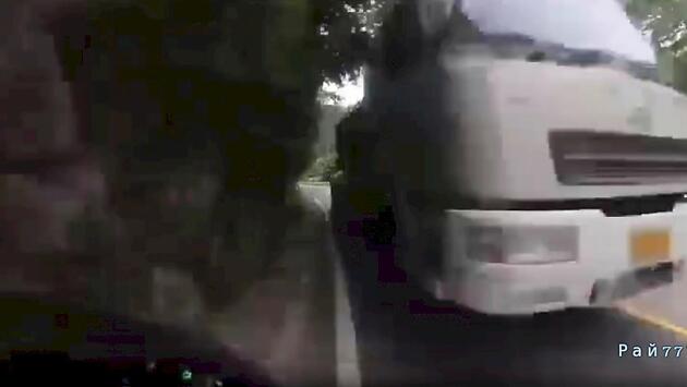 Мотоциклист, оказавшись на пути у грузовика, чудом избежал лобового столкновения