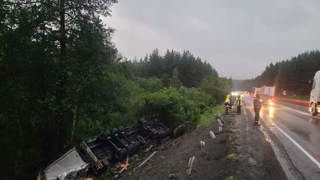 В какой-то момент машина по неустановленной причине выехала за пределы дороги и врезалась в металлическое барьерное ограждение. В итоге многотонный грузовик опрокинулся в кювет.