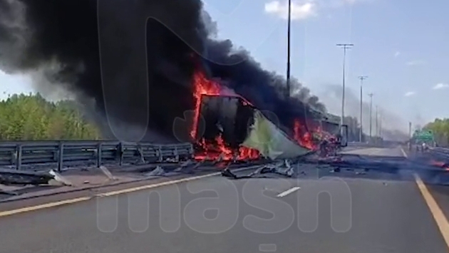 Инцидент произошел на 557-м километре платной дороги. По данным канала, водитель фуры не справился с управлением и врезался в отбойник, после чего грузовой автомобиль загорелся. Водитель не пострадал.
