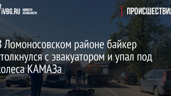 В Ломоносовском районе байкер столкнулся с эвакуатором и упал под колеса КАМАЗа