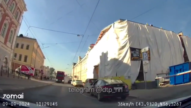 Фура без тормозов чуть не протаранила легковушку на улице Рождественской. Видео опубликовано в Telegram-канале «ДТП и происшествия Нижний Новгород».