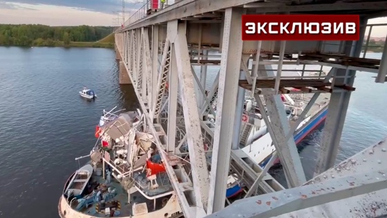 На кадрах видно, что железнодорожный мост не получил критических повреждений. Рубки танкера смяты и опущены вниз в результате удара с сооружением.