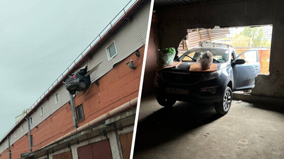 «Сегодня днем в здании гаражной парковки автомобиль пробил стену и повис над гаражами на уровне второго этажа. Чтобы предотвратить падение, его владелец положил на капот машины пакеты с утяжелителями», — говорится в сообщении канала.