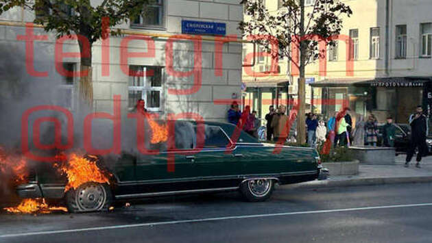 На видео попал загоревшийся в центре Москвы ретрокар Mercury Grand Marquis
