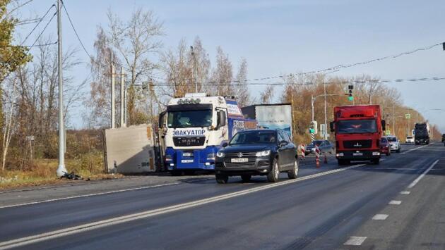 Вторая авария на том же участке дороги произошла с участием фуры с прицепом. Большегруз вылетел в кювет. На месте работал эвакуатор.