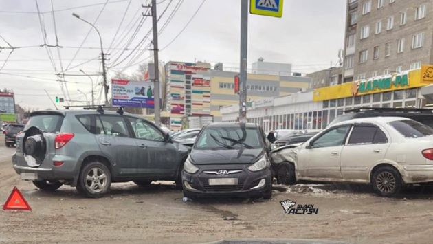 Массовая авария произошла у дома 201/1 на улице Бориса Богаткова. Около 12.45 столкнулись Nissan Sunny, Hyundai Solaris, Toyota Rav 4 и Tank 300.