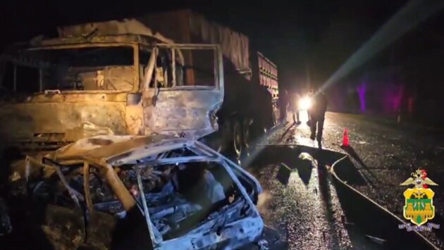 После столкновения ВАЗ загорелся. Огонь перекинулся и на большегруз.