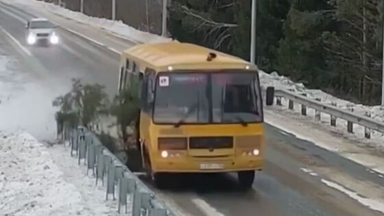 Камеры автоматического пункта весогабаритного контроля зафиксировали момент повреждения. На кадрах видно, как школьный автобус едет по дороге, при этом сосна, погруженная в транспорт, ветками ломает дорожные ограждения.