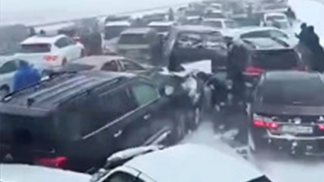 На трассе Астана-Щучинск между селами Когам и Каратал в Казахстане из-за тумана и непогоды столкнулись почти сто машин.