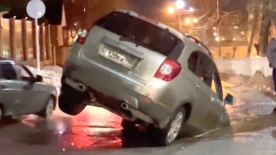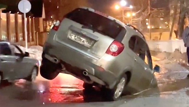 Сначала на улице Минина, недалеко от местного роддома, частично провалился под землю Chevrolet Captiva. Затем, в том же районе, еще одна машина провалилась на треть в образовавшуюся яму.