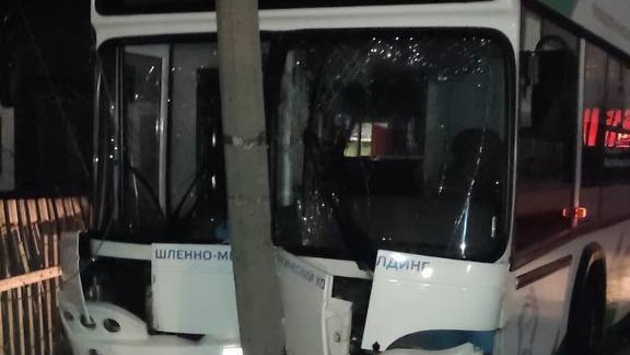 Автобус, перевозивший работников предприятия, врезался в столб на одной из улиц Кемерова.