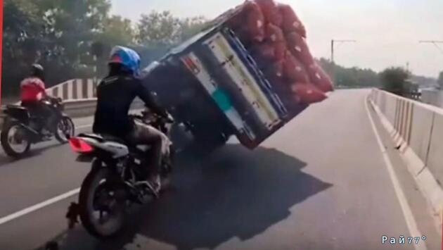 Тем временем: мотоциклисты не разъехались с грузовиками и попали на видео в КНР