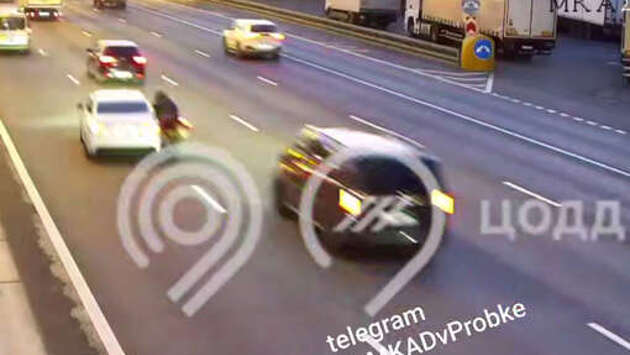 На МКАД на видео сняли, как мотоциклист отлетел на несколько метров в момент ДТП