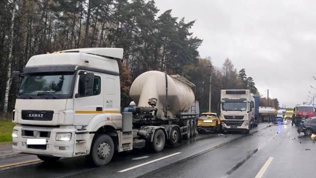 Трагедия произошла на 99-м километре трассы М2. Около 16:00 водитель грузовика потерял управление и столкнулся с попутными фурами и легковушками. Одну из иномарок зажало между длинномерами.