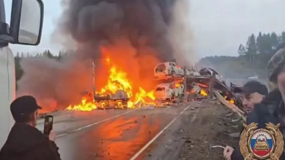 Среди участников ДТП семь грузовых автомобилей, в том числе автовоз, и один легковой. Известно, что после столкновения загорелись пять машин. Огнем охватило также автовоз, перевозивший семь легковых автомобилей.