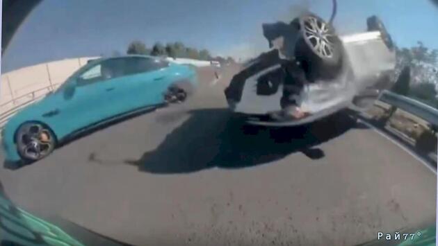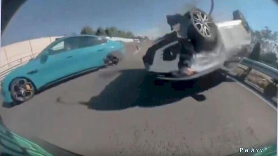 Автор полученного Рай77° видео написал в комментариях, что водитель легковушки на мгновение отвлёкся от управления транспортным средством, в результате чего автомобиль врезался в седан, перевернулся в воздухе и врезался в автомобиль, из которого велась видеозапись.