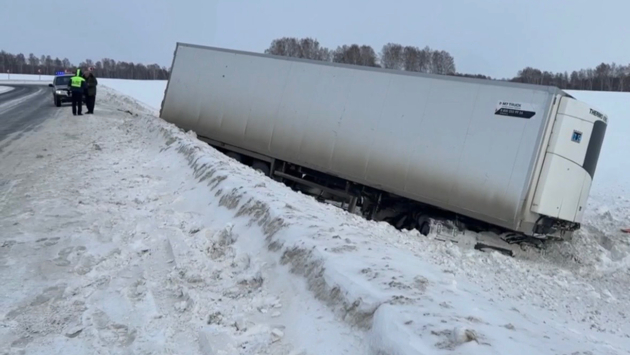 В Топкинском муниципальном округе фура съехала в кювет из-за непогоды.