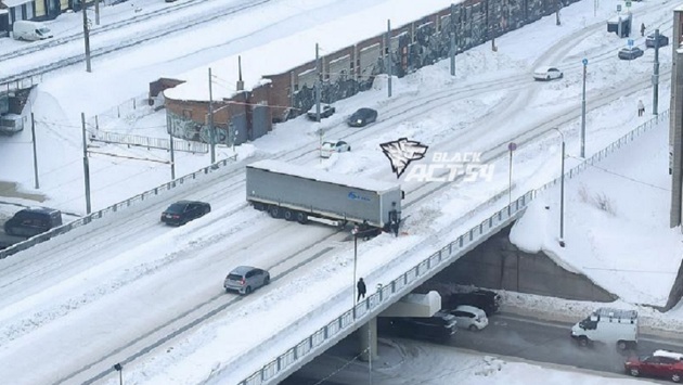 В Новосибирске очередной большегруз решил испытать счастья на улицах города. И на мосту над Ипподромской заблокировал проезд в одну сторону: прицеп развернуло на полосе.