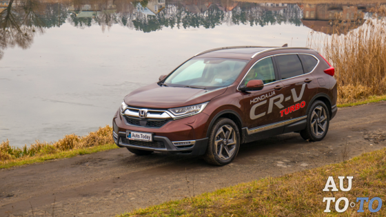 Honda CR-V – это особый автомобиль для нашего издания. Больше двух сотен машин назад именно с японского кроссовера предыдущего поколения на портале Auto.Today стартовал раздел потребительских тестов автомобилей. Но, все же, мы слишком углубились в личные воспоминания. Будем ближе к машине, тем более поговорить действительно есть о чем. Кроссовер такого размера с турбомотором относительно небольшого объема – сегодня нечастое решение на рынке. Тем интереснее будет тест. Правда, линейка силовых агрегатов на рынках Европы и Северной Америки у CR-V серьезно отличается. А вот предоставляемый уровень комфорта – у всех одинаковый. Смена облика Первое впечатление от японского кроссовера – это его относительно скромные габариты в сравнении с конкурентами и даже своим же предшественником. Забегая наперед, скажу – мнение ошибочно. Предыдущий CR-V почти не отличается внешними габаритами. Но косо расположенные передние фары, при этом сильно поднятые по углам, и бумерангообразные задние фонари несколько сужают машину визуально. Кстати, сама оптика заслуживает максимального количества лестных отзывов. Светодиодные фары имеют автоматический режим, также в блок головной оптики встроены отдельные светодиоды, включающиеся при повороте руля на малой скорости. У большинства конкурентов эту функцию выполняют «противотуманки», от которых эффект ниже, ведь они не направляют луч в сторону поворота. В зависимости от комплектации, машина может оснащаться 18-, или 19-дюймовыми (как на герое нашего теста) колесными дисками. Возможно, этот размер и великоват для украинских дорог, но на ходовых качествах большие диски отрицательно не сказываются. Еще одна прерогатива «топа» - это панорамная крыша на два ряда с большим сдвижным люком. В сравнении с предшественником, дорожный просвет увеличился на 2,5 см, до 208 мм. Поиски локации для фотосессии показали, что эта цифра вполне устроит среднестатистического украинца: и по разбитому проселку мы «попрыгали», и по полю «прошмыгнули», и к озеру максимально приблизились. Контролировать габариты автомобиля при таких маневрах, да и в городском трафике помогут датчики парковочного ассистента по периметру автомобиля и камера заднего вида. Примечательно, что последняя имеет три режима, отличающиеся по углу захвата и обзора изображения. Важно, что есть строго вертикальный вид, помогающий приблизиться как можно точнее к стоблику, или бордюру. Красиво делает «Пристегните ремень безопасности переднего пассажира», - именно так начинает разговор Honda CR-V со мной и напоминает нашему фотографу о необходимости пристегнуться. «Будет сделано», - отвечаю я. Давно, очень давно я не встречал «говорящих» автомобилей. Кстати, напоминания пристегнуться водителю я так и не услышал. Может всегда быстрее выполнял эту операцию самостоятельно. Торпедо кажется громоздким, но в действительности этого не ощущаешь. Проекционный дисплей предоставляет широкий перечень выводимой информации. В сравнении с младшенькой, с Honda HR-V, у героя нашего теста мультимедийная система справедливая. Она одинаково хорошо дружит с фирменными протоколами Apple CarPlay и Android Auto. Кроме того, инфотеймент имеет встроенные виджеты (калькулятор, календарь с событиями и пр.). Встроенная навигация Garmin отлично знает Киев, но вместе с тем самокритична – ругается, что может быть неак