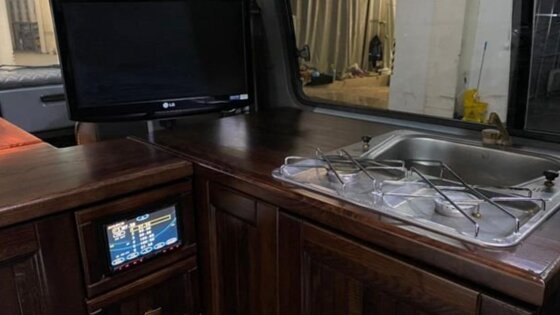 Коробка передач досталась самодельному дому на колесах от Камаза, а под капотом оказался японский двигатель на 195 л.с. В салоне добавлены газовая плита, рукомойник, холодильник, ТВ-система и двуспальная кровать. Встроенная мебель сделана из цельного дерева.